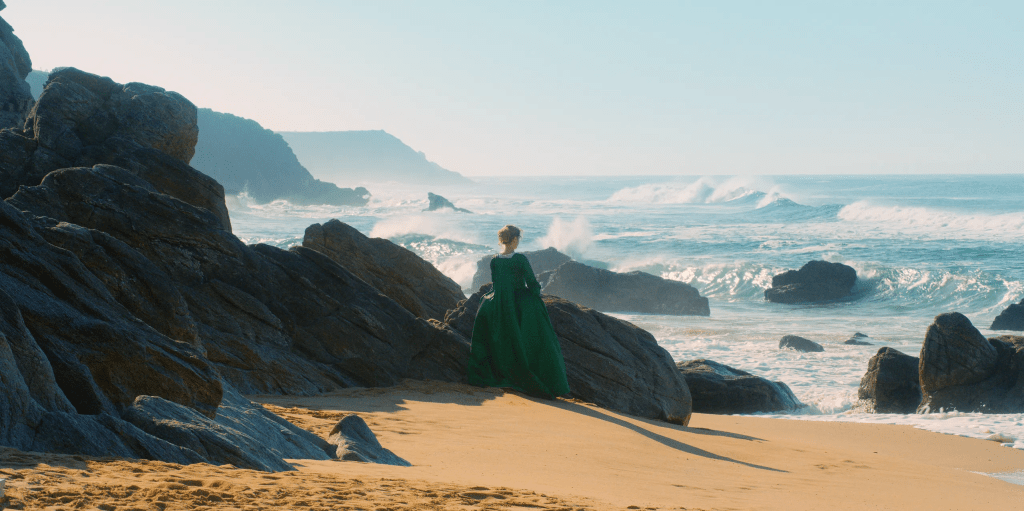 O frame escolhido foi uma poderosa imagem que retrata a tensão narrativa ao contrastar o rigor artificial do vestido verde esmeralda da protagonista com a brutalidade orgânica e desaturada da paisagem costeira. Ao utilizar a técnica Rückenfigur, posicionando a personagem de costas diante da imensidão do mar e das rochas, a imagem evoca a estética do Sublime romântico, onde a escala diminuta da figura humana não apenas ressalta sua fragilidade física, mas projeta na natureza agitada a turbulência interna e o isolamento contemplativo da protagonista.